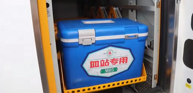驾驶室配备车载冷库启动,及设置装置,启动车辆后,冷系统自动启动也可通过手动按键,启动制冷并设定指定温度。驾驶室后方设有温度采集器,当冷库内温度异常时,温度监控模块会发出凤鸣报警;同时设有紫外线消毒灯定时模车辆夜间休息时,将自动启动消杀模式。驾驶室后方储存空间,可放置物品。