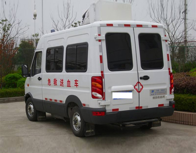 送血车采用国六汽车底盘改装,车厢安装有冰箱,柜体有冰箱,耗材等血液恒温箱等送血专用设备。用于血液运输使用。送血车出车前可用220V市电供制冷单元供电。运输中由发动机供电。当车辆发生故障时,由蓄电池通过逆变器供电,保证所送血液质量箱温控制精确,可控制在设定温度±1℃车厢安装有车载冰箱、冰箱柜体、血液恒温箱等专用设备,用于血液运输。 红细胞,血浆箱温度互相转换,或者统一温度血浆箱温度可控制在负22℃。送血车车身外观喷涂或者粘贴红十字、急救标识,120急救送血,送血车血液储存柜1套。