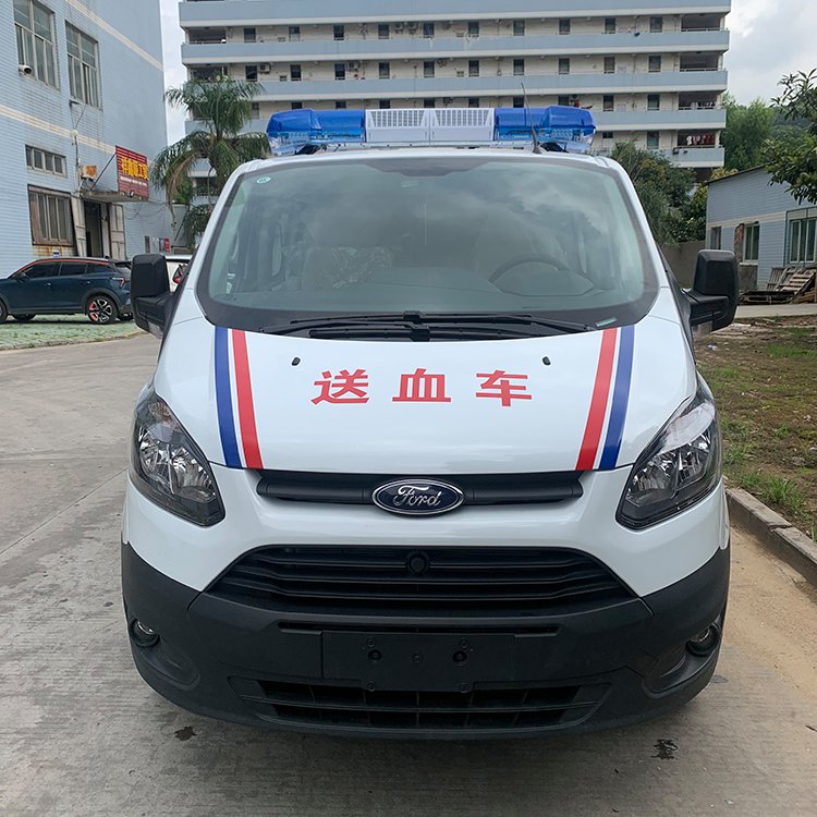 江铃福特新全顺V362送血车,该车以江铃福特新全顺V362为基础车型进行改装,外部尺寸为5341×2032×2066/2407mm、内部尺寸为2300/2700×1700×1700mm、柴油发动机、德国PUMA动力系统、2.0L排量、最大功率90kw、进口手动5挡变速箱、前置后驱、麦弗逊式/板钢弹簧悬挂系统、最高时速156公里、最大载客人数9人。