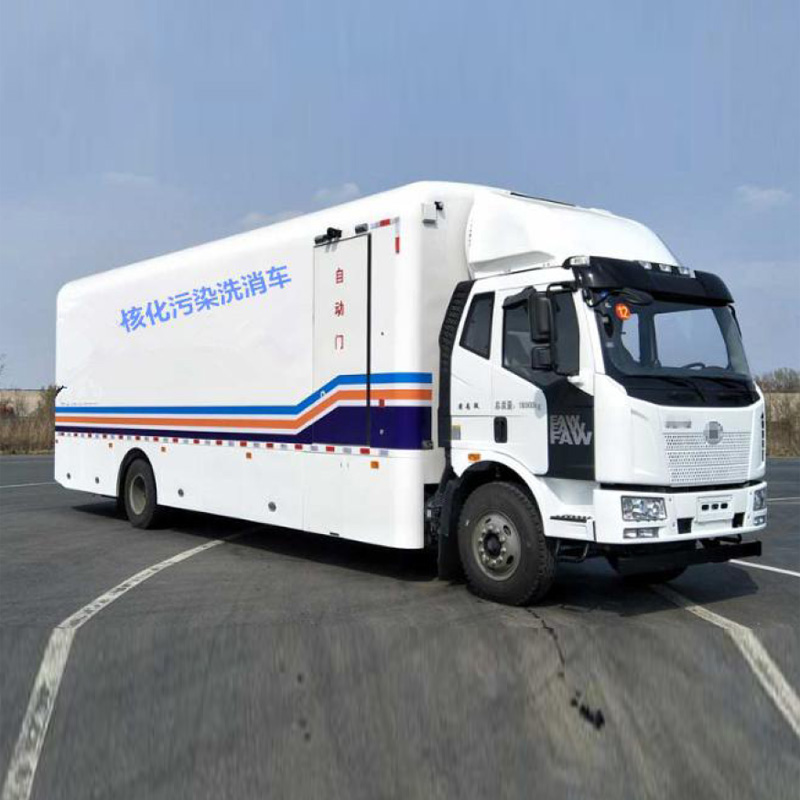 5. 核化污染洗消车洁净区包括全身红外烘干设备、座椅、毛巾柜、衣柜和控制台并设置有照明、空调和新风系统。本发明的积极效果在于:移动展开迅速,可快速抵达突发事件现场开展被污染人员洗消;不仅自带水箱和洗消液箱,功能齐全,布局合理,还可外接水源供水,并可实时补充洗消液,自带的水箱和洗消液可满足125 人次去污洗消具有操作方便、行动快捷、自动化程度高,符合国际医学救援规范和国家标准,符合核化污染人员去污洗消流程和规范;满足应急救援快速需求,洗消车范围设计制造,功能齐全,配备有车辆实时卫星定位、.洗消后放射性水平检测、核素识别功能,功能全;内外光洁、不易沾染、便于去污、可重复多次使用;.它不仅可以快速抵达核化突发事件现场开展被核化污染人员的现场去污洗消,又可停放在核化损伤救治基地和定点医院作为二次洗消用房。是核化突发事件放射性物质或化学物质污染人员去污洗消必配装备。