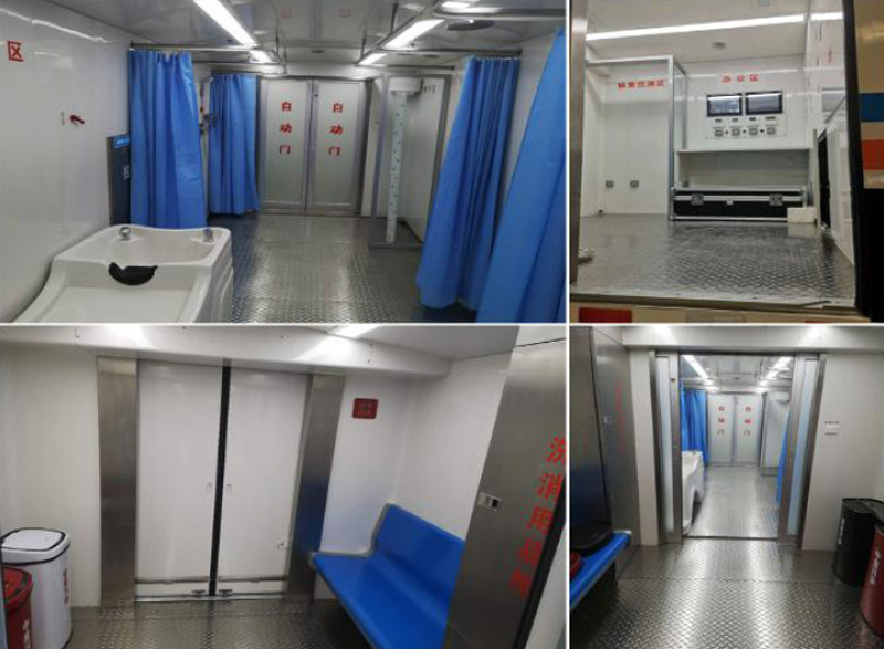 2. 核化污染洗消车空调系统安装在车厢与车头之间;水箱、洗消液箱安装在车厢外部;车厢防腐密封结构,车厢厢体外壁和内壁均采用光滑和圆角结构,内外光洁。车厢内包括污染区、洗消区、清洁区、感应推拉门、双开塞拉门、单开塞拉门;污染区、洗消区和清洁区由感应推拉门相互隔离;从污染区进入洗消区以及从洗消区进入清洁区需经过红外感应平移非接触式感应推拉门;污染区的入口安装双开塞拉门;洁净区的出口安装单开塞拉门;升降平台安装在污染区入口和清洁区出口开塞拉门外;污染区包括洗消用品柜、污染衣物回收箱、排风系统、空调系统;洗消区包括洗眼、洗头、局部洗消、全身洗消、新风系统、排风系统、空调系统、污水排放口和外接污水收集袋;清洁区包括中控平台、核辐射检测仪、更衣柜、烘干室、电器柜、新风系统、空调系统;核辐射检测仪为门柱式辐射仪,安装在清洁区感应推拉门旁侧;人员每通过感应推拉门前由核辐射检测仪进行辐射水平检测及核素检测。