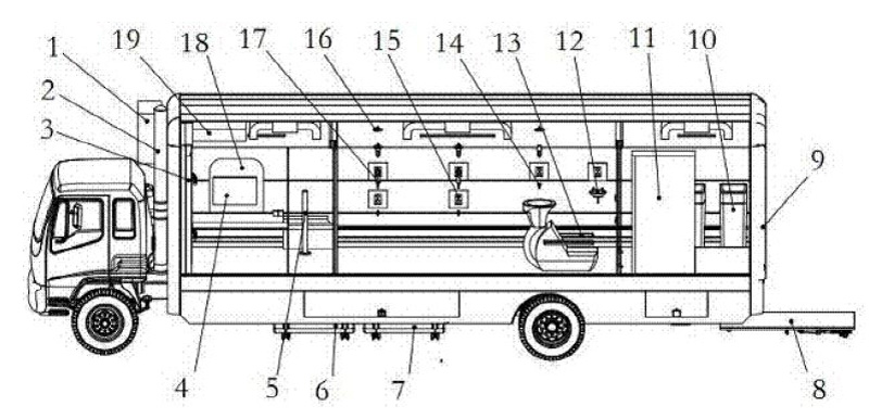 1. 核化污染洗消车;包括供电系统、照明系统、空调系统、供水及温控系统、洗消液供给及温控系统。其特征在于:还包括车厢、水箱、洗消液箱、升降平台、水管路入口、电器控制线入口;所述装置结构皆集成安装在一部车上。
