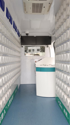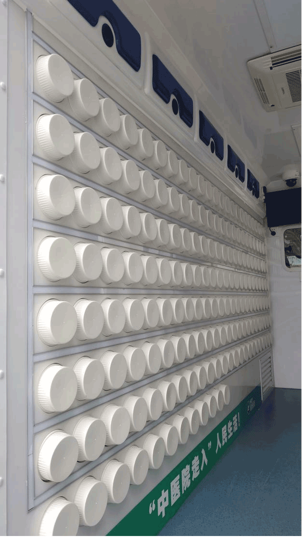 该款移动中药房车可搭载麻黄、细辛、生姜、葛根、菊花、丹皮、青蒿、生地等上百种中药,车内即可实现快速智能配药。当配药医护拿到药方,找到所需要中药,放入自动发药机中,数分钟就可以完成药物发放。