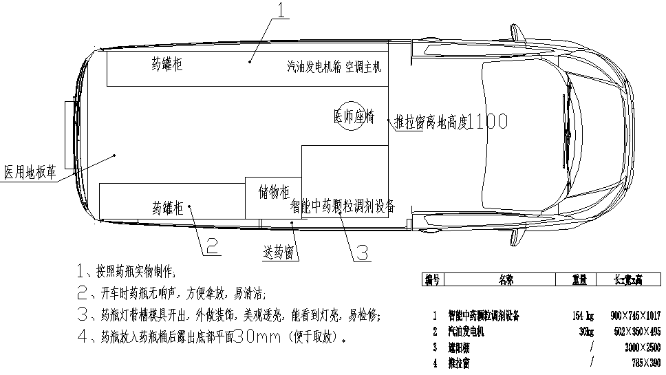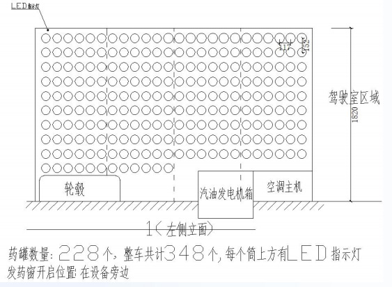 药瓶柜采用车内一体式设计,开模定制按药瓶φ91mm设计,药瓶放入药瓶桶后露出底部平面30mm(便于取放)。每个药瓶桶有LED指示灯,采用灯带的安装方式。药瓶桶的左右中心距离117mm,上下中心距离152mm,车内共配有348个药品桶。