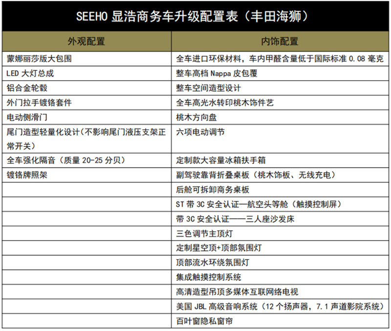 在内饰设计上改装商务车丰田海狮注重简约与大气的完美结合,在展示商务车本身尊贵与大气的同时,也将带来不一样的旅行体验。